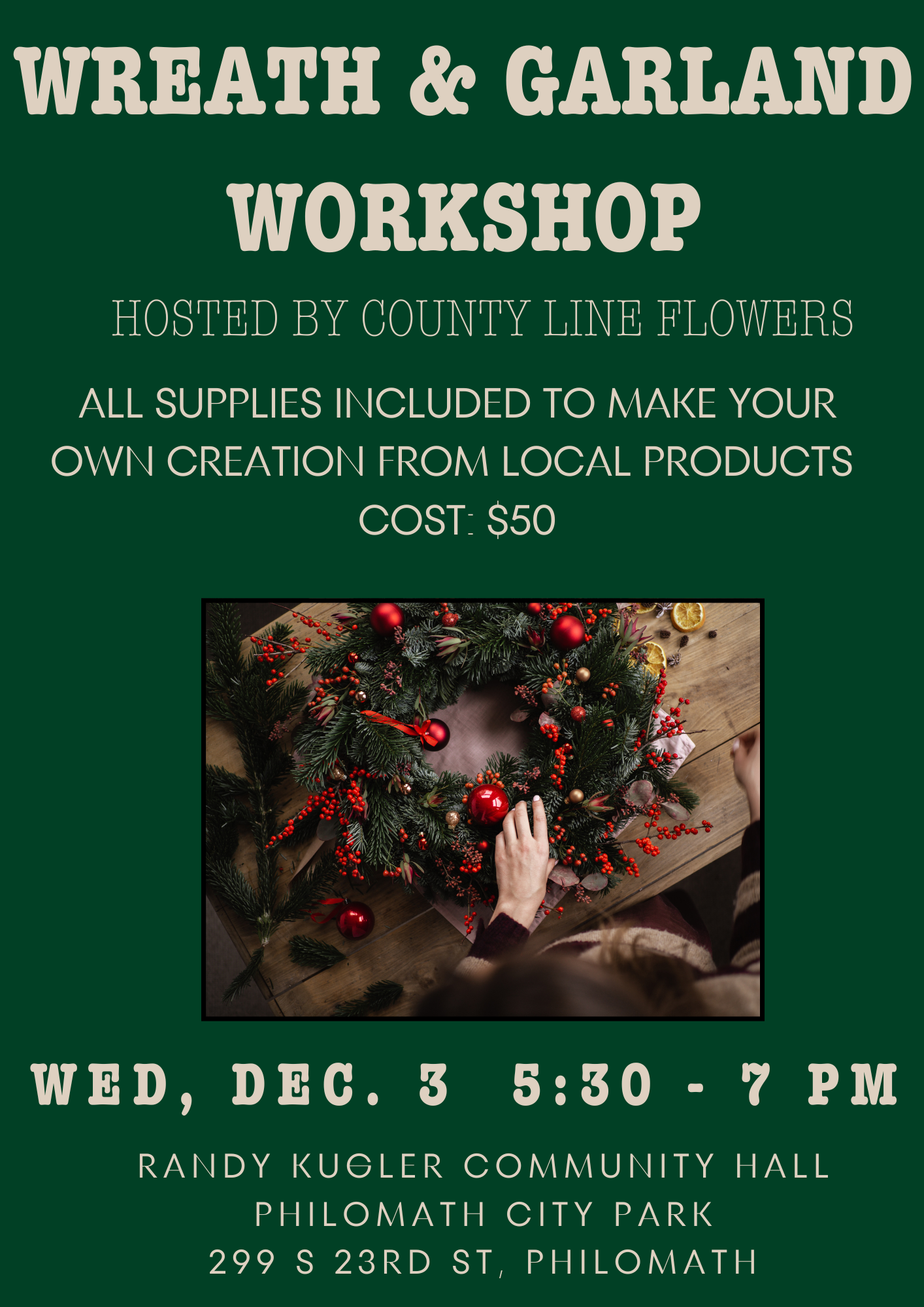 This event will be held at the Randy Kugler Community Hall in Philomath City Park. Enjoy a fun and creative evening crafting your own wreath or garland creation from locally grown foliage, evergreens and unique dried elements. Pami, owner of County Line Flowers florist, will lead you in a demonstration on how to construct your wreath or garland. You will get to choose colors and materials . All supplies included. Flowers and foliage will be purchased from Charles Little and Co & Pink Petal Flowers in Eugene.
