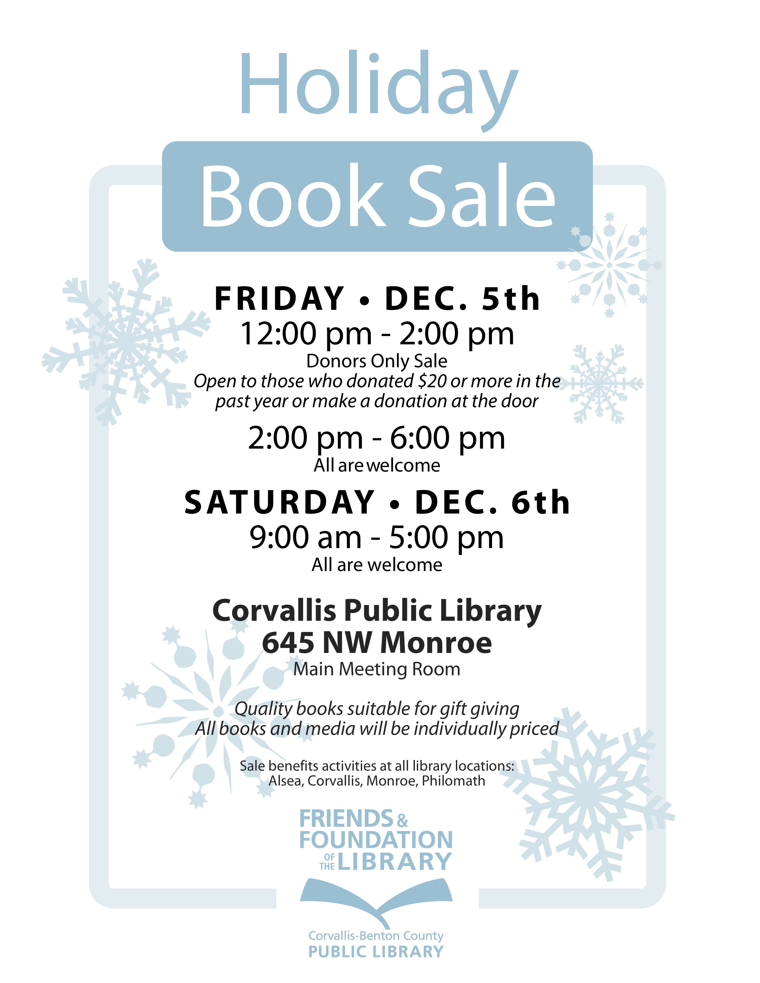 The Friends and Foundation of the Library's Holiday Book Sale will have excellent quality used and new books for sale. Books for all ages, CDs, DVDs, book bags, craft table and refreshments!