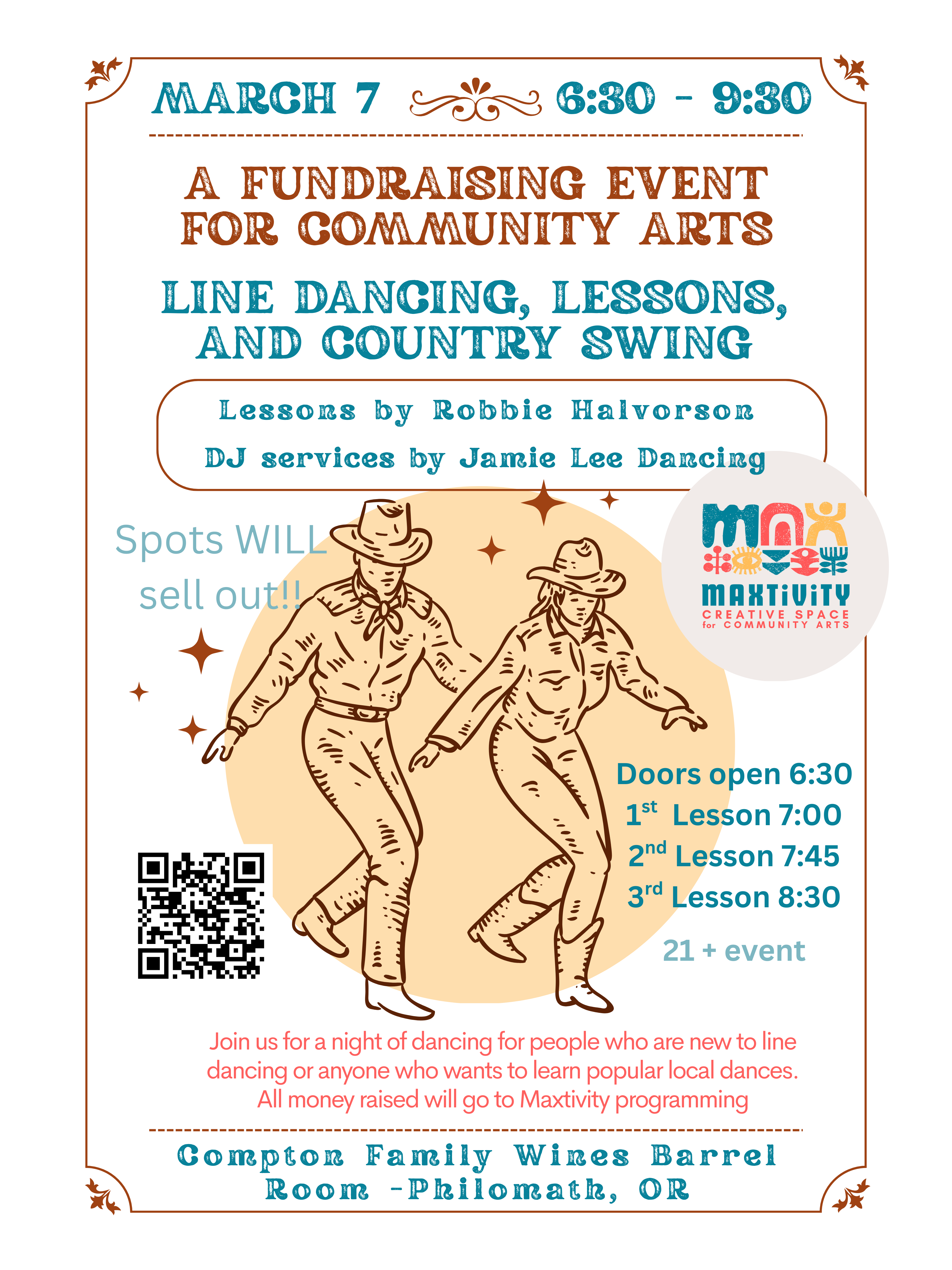 Join us for a night of line dancing and a swinging good time! This is a ticketed event and all skill levels welcome - for beginners or anyone who wants to learn new local dances. Lessons by Robbie Halverson, and DJ services by Jamie Lee Dancing. All proceeds from the event support Maxtivity Creative Space for Community Arts.